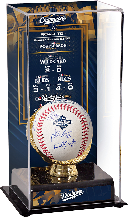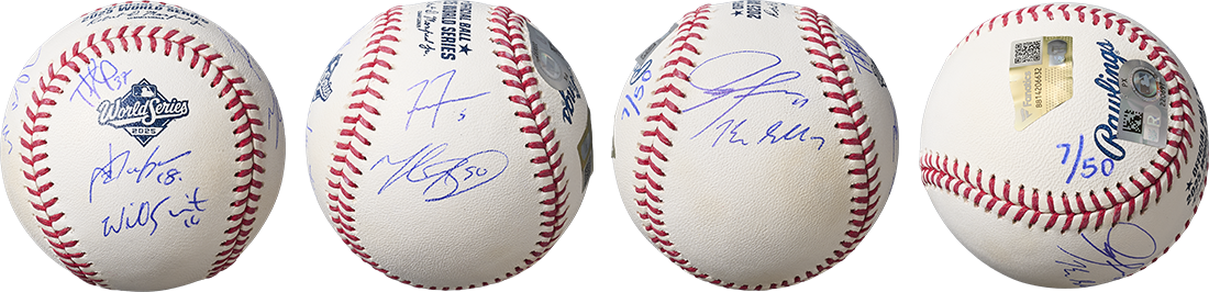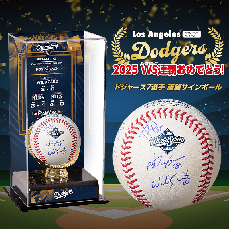 ワールドシリーズ連覇という輝かしい大勝利を収めたロサンゼルス・ドジャース。そんなドジャースの選手7名が直筆でサインをしたWS公式ロゴ入りボールです。WS優勝記念の展示ケースと合わせてお届けします。
