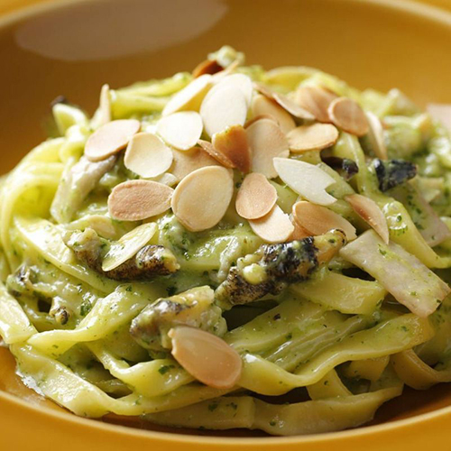 バターにニンニクと刻みパセリをたっぷり加えて作った、鮮やかな緑色が美しいブルゴーニュバターソースに、つぶ貝とエリンギを具材にした、まるでフランス料理のエスカルゴを食べているような感覚を楽しめる一品です。このクリーミーなソースには、平打ちのフェットチーネがよく合います。召し上がる際に別添のローストアーモンドをトッピングし、こうばしい香りと食感も合わせてお楽しみください。