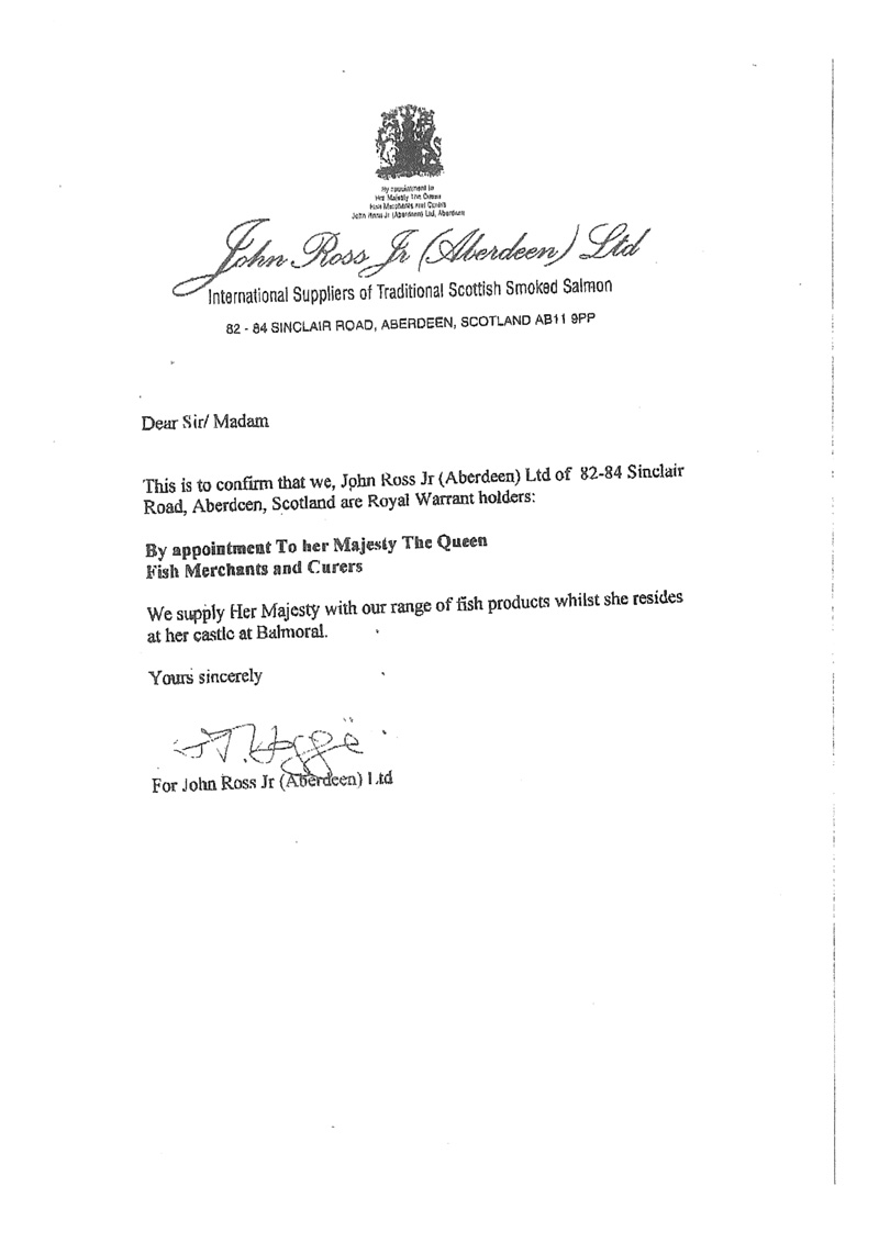 ジョンロスJr.の書状(英国女王の御用達であることと女王のバルモラル城滞在時に魚を供給することを証明したもの)