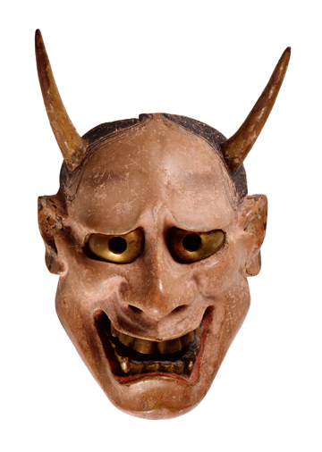 頭の左右に金色の角、大きく見開いた眼と両端が深く裂けた口からあらわれる歯や牙も金色に妖しく輝き、恐ろしい顔です。しかし、眉根を寄せた目には深い哀しみもうかがえます。「道成寺」「葵の上」など女性の激しい嫉妬を描いた曲に用いる面です。般若とはこれを生み出した面打ち(能面作家)の名前です。細川家に伝来したこの面は、その般若の作の可能性があるきわめて優れた、貴重な面です。江戸時代にはこの面の写しが盛んに造られました。