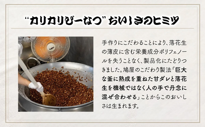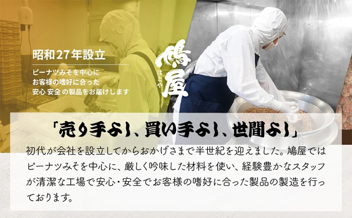 鳩屋ではピーナツみそを中心に、厳しく吟味した材料を使い、経験豊かなスタッフが清潔な工場で安心・安全でお客様の嗜好に合った製品の製造を行っております。