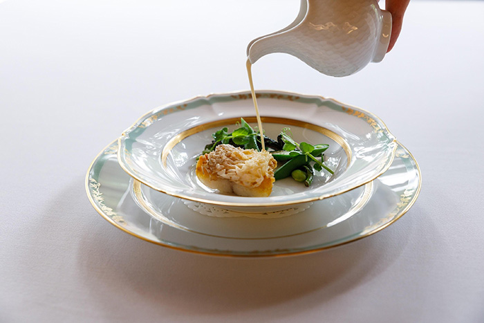 シェフ橋本和樹の出身地である滋賀や京都大原の新鮮な野菜、 丹波牛・七谷鴨・ぐじなどの京の食材を、フレンチの手法を用いて表現。食材を巧みに組み合わせ、伝統的なフランス料理の技法を核に、京都らしいニュアンスを添えたクラシカルなフレンチを提供します。