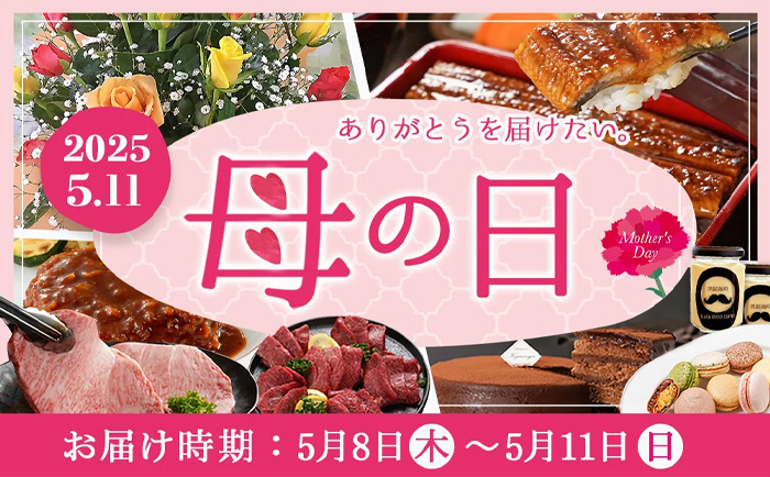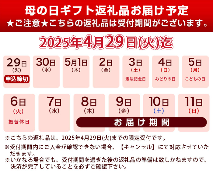 | 発送日 | 寄附金受領確認後、5月8日(木)〜5月11日(日)にお届けいたします。 ※お届け日のご指定はお受け致しかねます。 ※配送地域、交通事情等により、お届けが前後する場合がございます。あらかじめご了承ください。 |