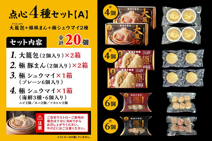 横浜大世界で人気の冷凍グルメの大籠包、極 豚まん、極 シュウマイ2種の入った開華楼を満喫いただけるセットです。