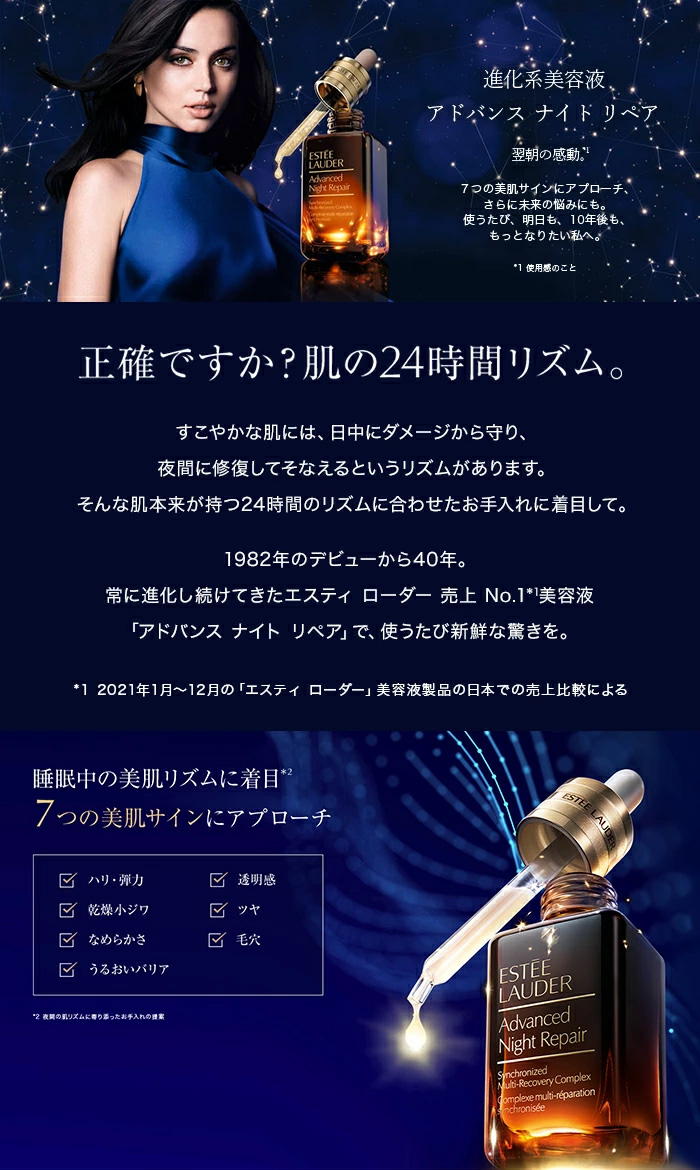 肌は遺伝より環境や食生活、ライフスタイルの影響の方が大きいことから、エスティ ローダーは毎日のスキンケアの重要性に注目しました。まずは、環境ストレスが与える乾燥などの肌ダメージを溜めこまないこと。独自成分、クロノラックス™ パワー テクノロジーを配合した「アドバンス ナイト リペア」は、肌本来の働きをサポートし、ファストリペア*で、肌にみずみずしいうるおいとハリをもたらします。毎日続けることで、使うたびに、生命感あふれるような輝き。若々しい印象のすこやかな美しさを肌に届けます。