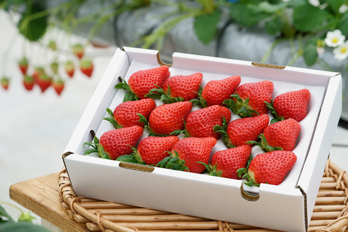当園では「女峰」本来の力を引き出すため、徹底した温度、二酸化炭素濃度、肥料濃度等の環境管理と、わき芽、蕾を分化直後に取ることで、いちごが作り出すエネルギーを無駄なく実に送れるようにしています。