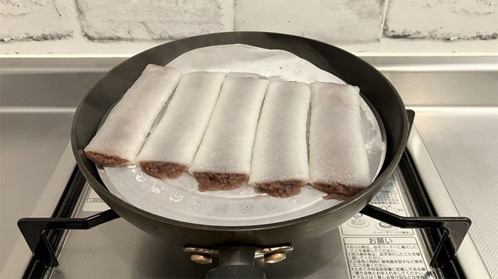 冷凍された状態の平川ようかんを一度に5本ずつ、ご家庭の「せいろ」や蓋のできる「フライパン」