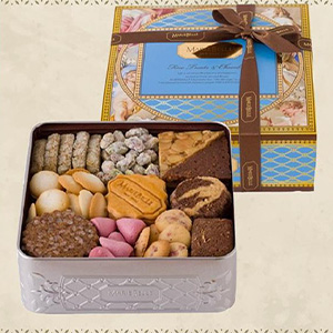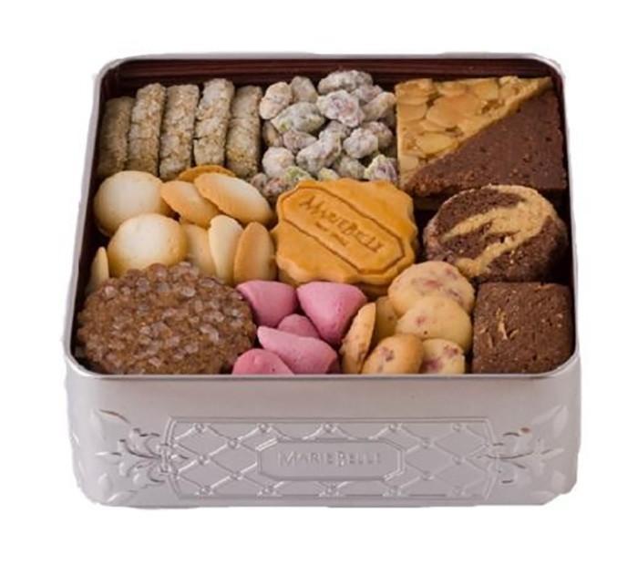 缶を開けると上質なバターの豊かな香りが広がり、マリベルロゴ入りのナンテやオリジナルチョコレートとナッツのクッキー、甘酸っぱくサクサク食感のラズベリーメレンゲなど、バラエティに富んだ焼き菓子が楽しめます。風味と食感が豊かで味わい深いので、ギフトにもおすすめです。ご自身の贅沢なひとときもお楽しみいただける一品です。