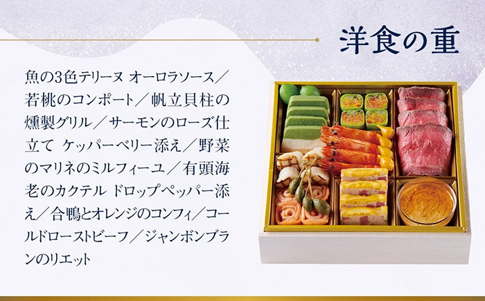 帆立の照り焼き/海の幸のすり身蒸し/栗きんとん/黒豆煮/海老すり身の湯葉巻/数の子の紹興酒漬/菜の花/有頭海老の旨煮/クラゲの胡麻ソース和え/いくら醤油漬/蟹肉の錦糸巻/叉焼/穂付筍の煮込み/蕪の紅白甘酢漬/ローストビーフ/松笠鳥賊の照り焼き/合鴨ロースのスモーク/鶏肉の焼きもの米麹風味/ワカサギのピリ辛黒酢風味漬
