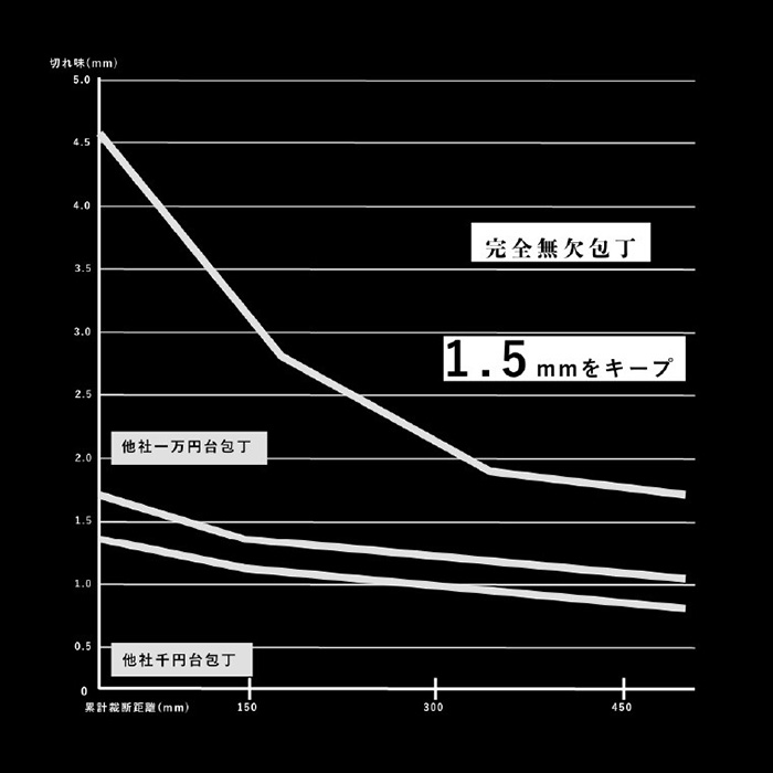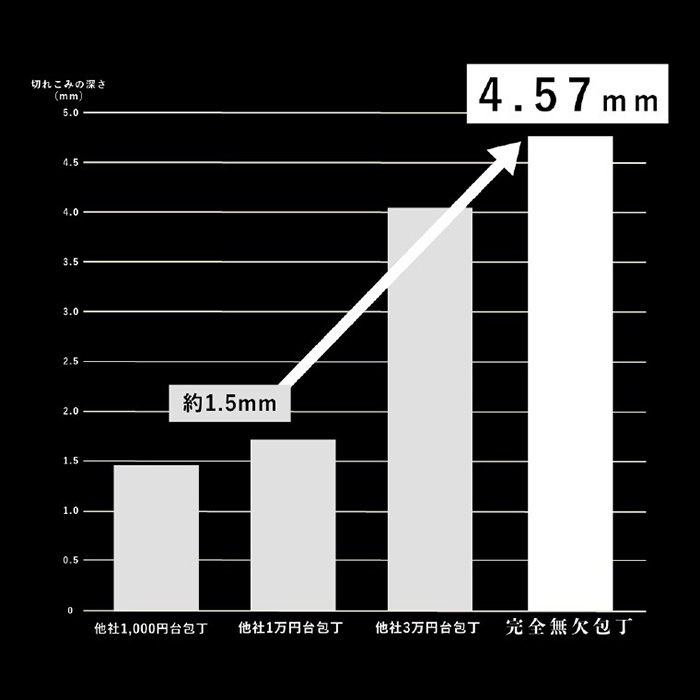 完全無欠包丁の切れ味を他社製品と比較試験したところ、約3倍の差があることが判明。
