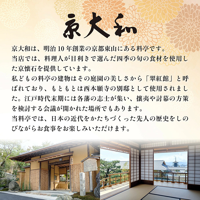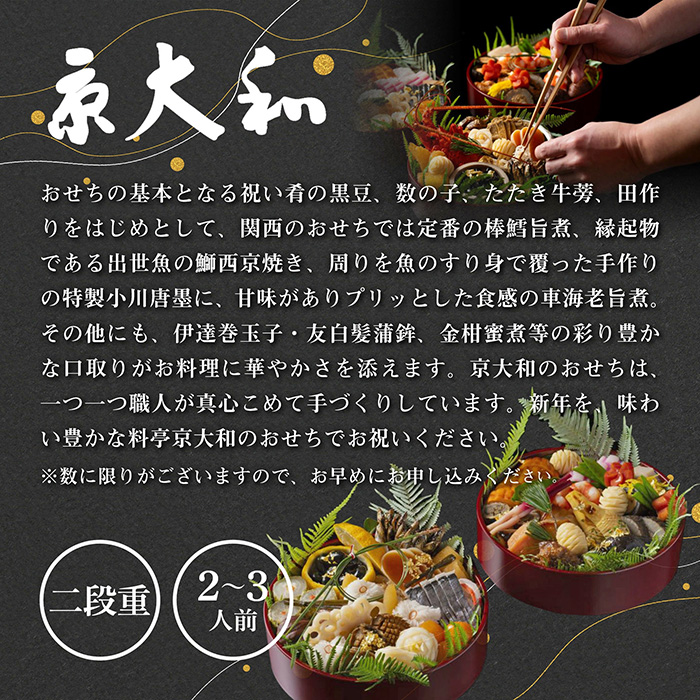 明治10年創業の京都東山にある、大手グルメガイド2つ星獲得の老舗料亭、「京大和」の職人が真心こめて手づくりしたおせちで新年をお祝いください。