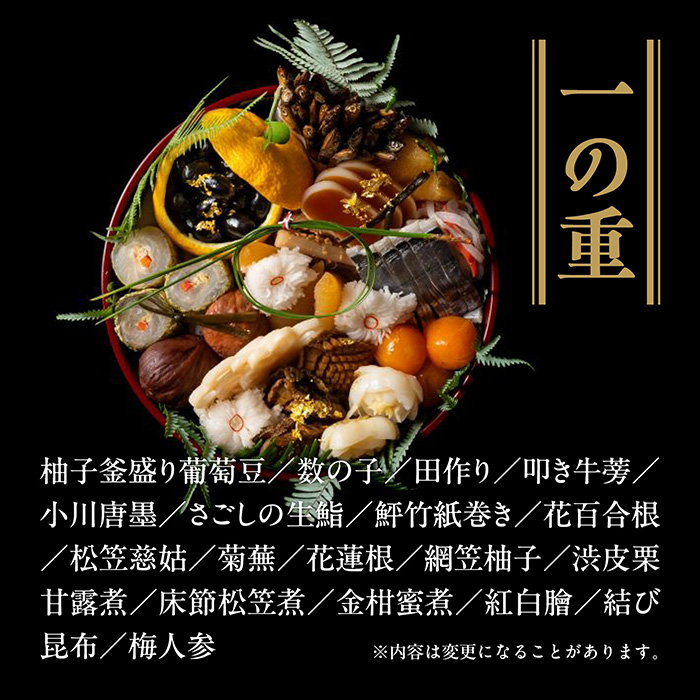 柚子釜盛り葡萄豆、数の子、田作り、叩き牛蒡、小川唐墨、さごしの生鮨、鮃竹紙巻き、花百合根、松笠慈姑、菊蕪、花蓮根、網笠柚子、渋皮栗甘露煮、床節松笠煮、金柑蜜煮、紅白膾、結び昆布、梅人参