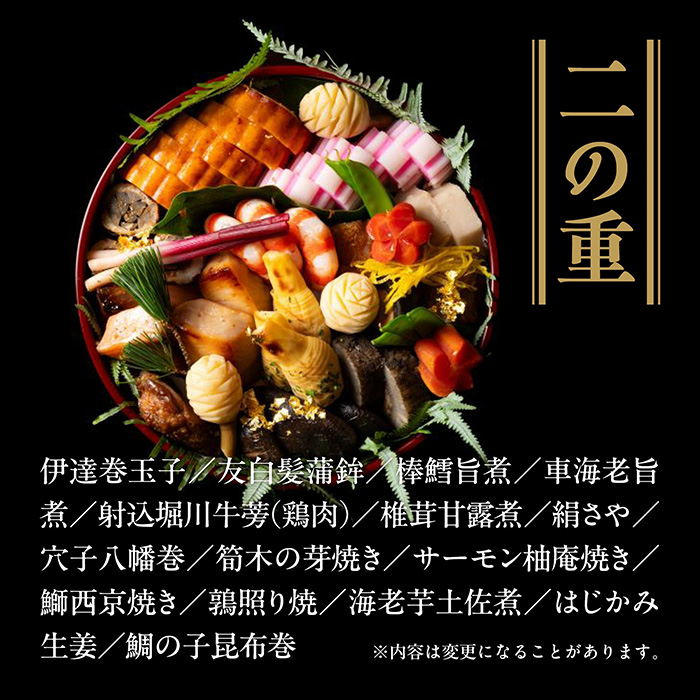 伊達巻玉子、友白髪蒲鉾、棒鱈旨煮、車海老旨煮、射込堀川牛蒡(鶏肉)、椎茸甘露煮、絹さや、穴子八幡巻、筍木の芽焼き、サーモン柚庵焼き、鰤西京焼き、鶉照り焼、海老芋土佐煮、はじかみ生姜、鯛の子昆布巻