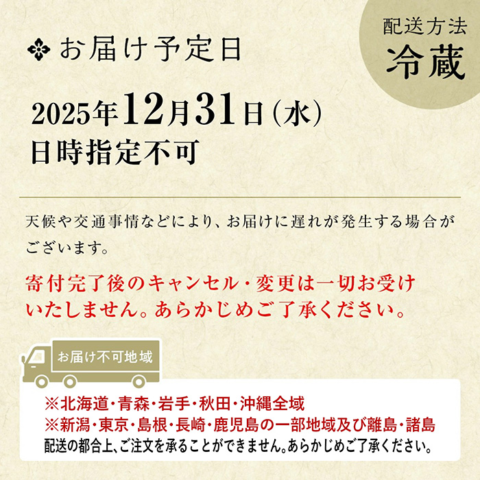 発送日 | 【お届け予定日】寄附金受領確認後、2025年12月31日に発送します。(日時指定不可)