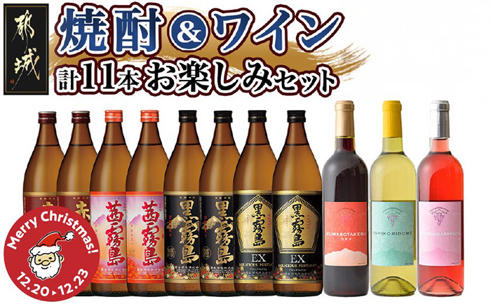 濃厚なコクと、冴えわたる後味の黒霧島、華やかな香りとフルーティーな香りの茜霧島等、霧島酒造人気焼酎8本に、都城ワイナリーから、赤・白・ロゼの3本をお届けいたします。