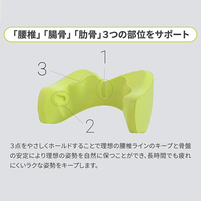 ■W型に設計されたクッションが腰椎と腸骨と肋骨の3点をやさしくホールドすることで理想的なS字ラインの座り姿勢を自然と保つことができます。