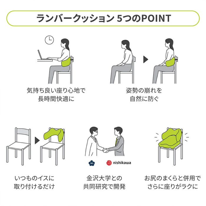 ■ランバークッションを使用することで坐骨にかかる圧力を背面に分散し、心地よく、長く座れます。