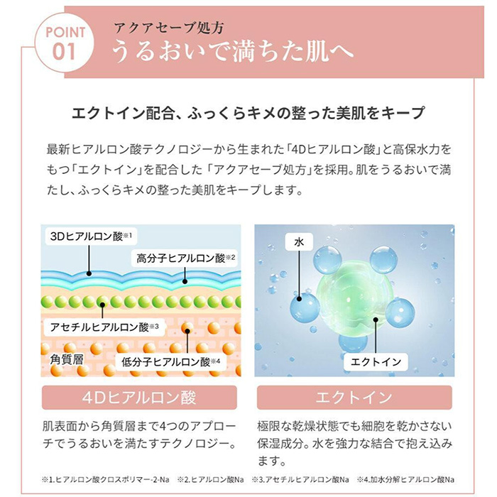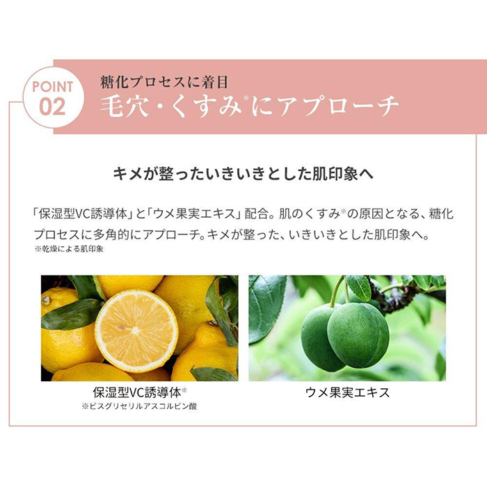 最新テクノロジーから生まれた「4Dヒアルロン酸」と高保水力を持つ「エクトイン」を配合。肌をうるおいで満たし、ふっくらキメの整った美肌をキープ。「保湿型VC誘導体」と「ウメ果実エキス」で肌のくすみ※1にアプローチ。