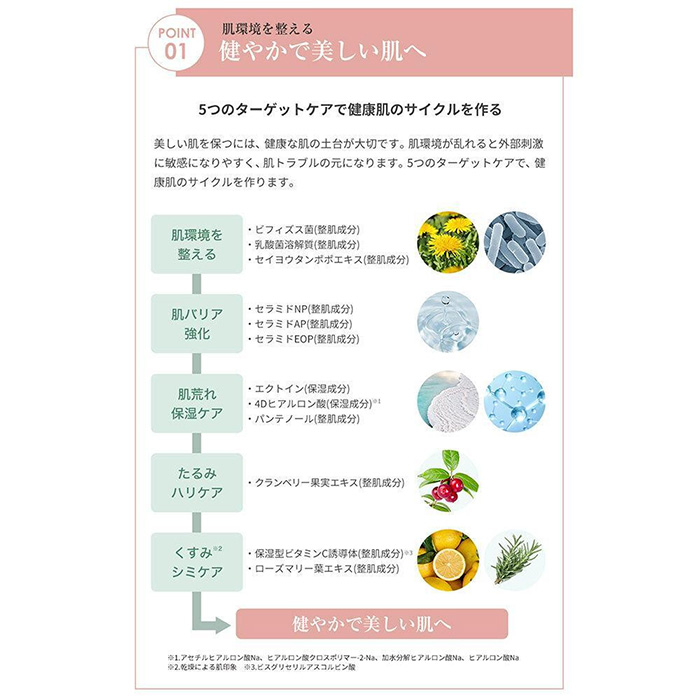 「肌環境を整える」、「肌バリア強化」、「肌荒れ保湿ケア」、「たるみハリケア」、「くすみ※1シミケア」の5つのターゲットケアで健康肌のサイクルへ。