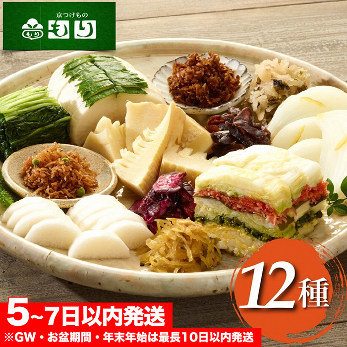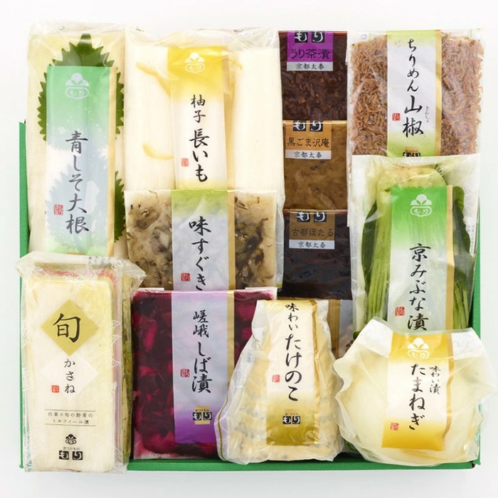 古都ほたる40g・うり茶漬け40g・黒ごま沢庵40g・青しそ大根1/2本・嵯峨しば漬125g・味すぐき125g・ゆず長いも3本・京みぶ菜130g・ちりめん山椒55g・旬かさね1個・味わい漬たまねぎ1個・味わいたけのこ1/2個