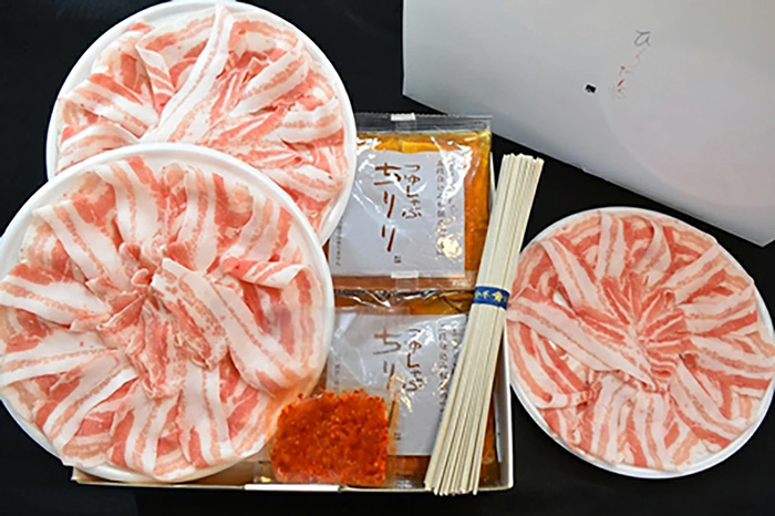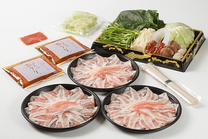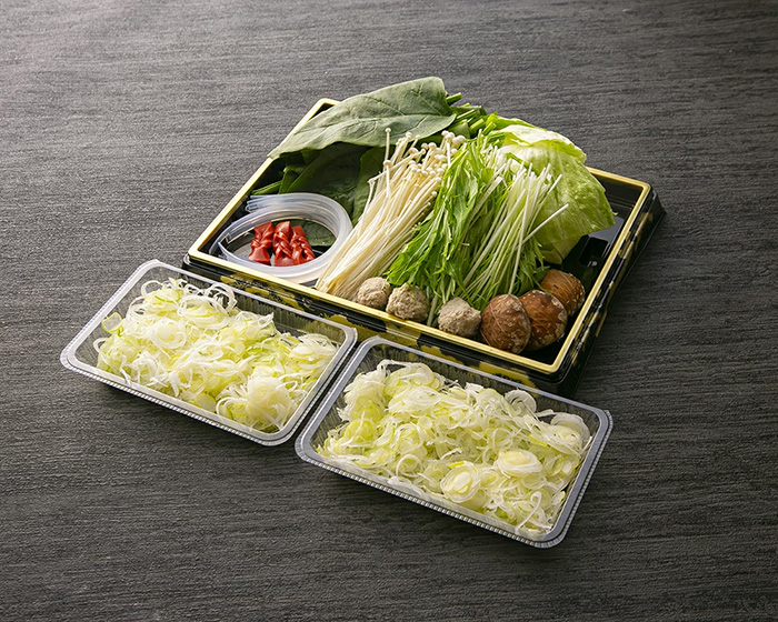 つけだれ(しょうゆ(国内製造)、本みりん、かつお節、さば節、昆布、煮干し)、野菜(ほうれん草、水菜、レタス、えのき、椎茸)、肉団子(豚ミンチ、玉ねぎ、卵、牛乳、パン粉、生姜、塩、白胡椒、薄口?油)、バームクーヘン豚(国産)、そば(小麦粉、そば粉、食塩)、くずきり、赤こんにゃく、柚子唐辛子(柚子皮、唐辛子、食塩)/こんにゃく用凝固剤(水酸化カルシウム)、着色料(三二酸化鉄)、(一部に小麦・そば・豚肉・大豆・さば・卵・乳成分を含む)