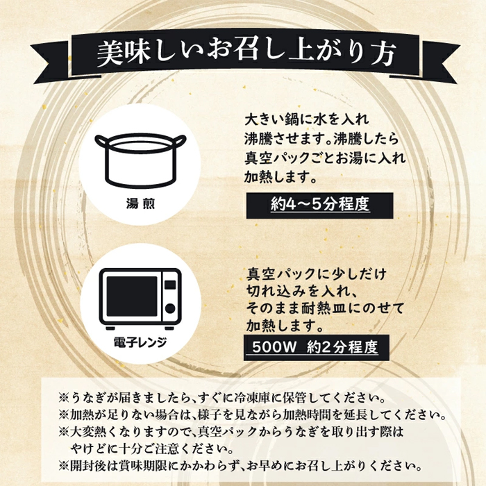 熟練の職人が一枚一枚手作りしたうなぎの蒲焼きを真空パックしています。湯せんかレンジで温めるだけで出来立てのおいしさをご家庭で味わうことができます。創業当時から受け継がれてきた秘伝のタレと山椒付き。
