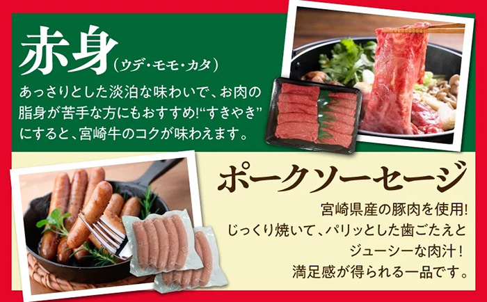 宮崎牛の「ヒレ・サーロイン・赤身」の3部位と、宮崎県産の豚肉を使用した“ポークソーセージ”も味わえる「クリスマス」だけのセットです。