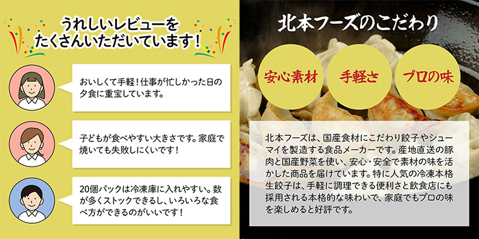 長年愛され続ける餃子の人気店「北本フーズ」から、こだわりの冷凍餃子が返礼品として登場!「美味しくて手軽な餃子」として多くの人に選ばれ続け、28年。一度食べたら手放せなくなること間違いなしです。冷凍庫にストックしておけば、いつでも手軽にプロの味が楽しめます。20個入りのコンパクトなパックなので、冷凍庫の中でも場所を取りません。