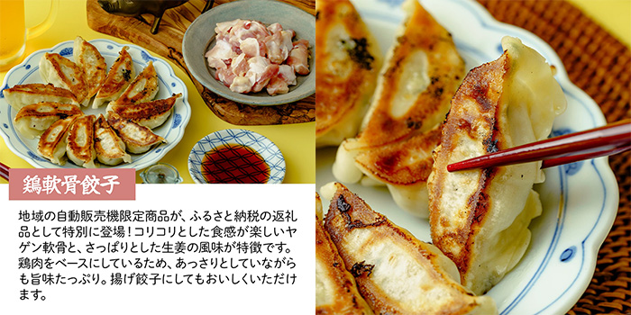 地域の自動販売機限定商品が、ふるさと納税の返礼品として特別に登場!コリコリとした食感が楽しいヤゲン軟骨と、さっぱりとした生姜の風味が特徴です。鶏肉をベースにしているため、あっさりとしていながらも旨味たっぷり。揚げ餃子にしてもおいしくいただけます。