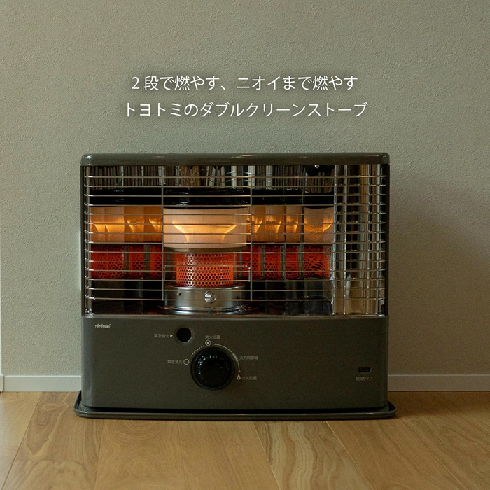 ダブルクリーンは1つの燃焼筒に2つの燃焼方式を組み込んだトヨトミ独自の燃焼方式です。下部の「赤熱式」燃焼で遠赤外線を発生させます。上部の「白光炎式」燃焼は下部の赤熱式を通ってきた燃焼ガスをさらに高温の1200℃で燃焼させます。これによりニオイの元となる灯油の燃え残しが減少し、ニオイも大幅に低減されます。さらにダブルクリーンは通常より大きな火力調節が可能で、小さい火力でも燃焼させることが可能なので、灯油の節約も可能です。