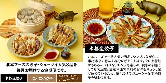 長年愛され続ける人気店「北本フーズ」から、こだわりの冷凍餃子2種と国産豚肉ジャンボシューマイが月替りで楽しめる返礼品が登場!「美味しくて手軽」と多くの人に選ばれ続け、28年。餃子もジャンボシューマイも、一度食べたら手放せなくなること間違いなしです。冷凍庫にストックしておけば、いつでも手軽にプロの味が楽しめます。餃子2種はそれぞれ20個入り、国産豚肉ジャンボシューマイは10個入りのパックを2パックずつお届け。コンパクトなパックなので、冷凍庫の中でも場所を取りません。