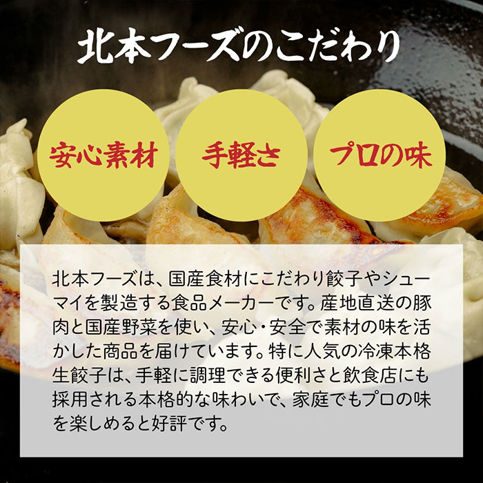 北本フーズは、国産食材にこだわり抜いて餃子・シューマイを製造しています。原料の豚肉は産地直送、野菜はすべて国産を使用。素材の良さを最大限に引き出し、安心安全な商品をお届けしています。