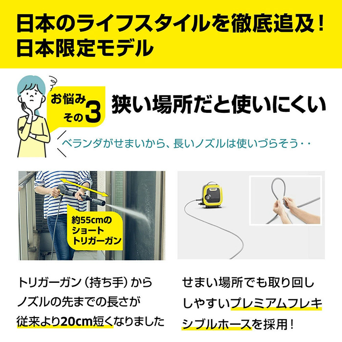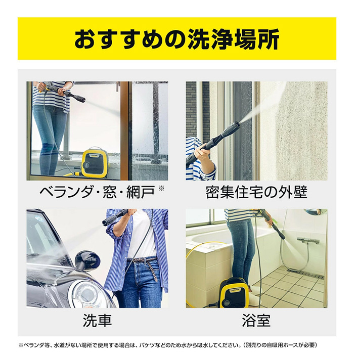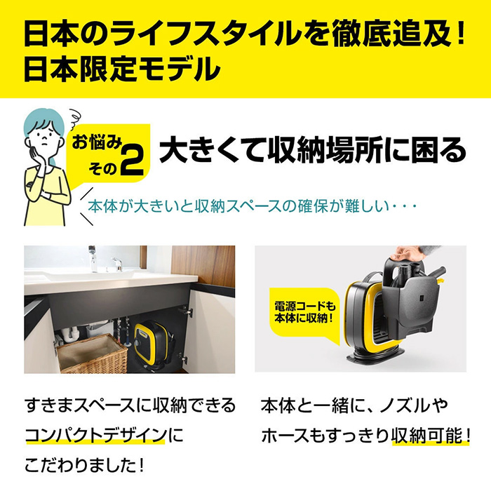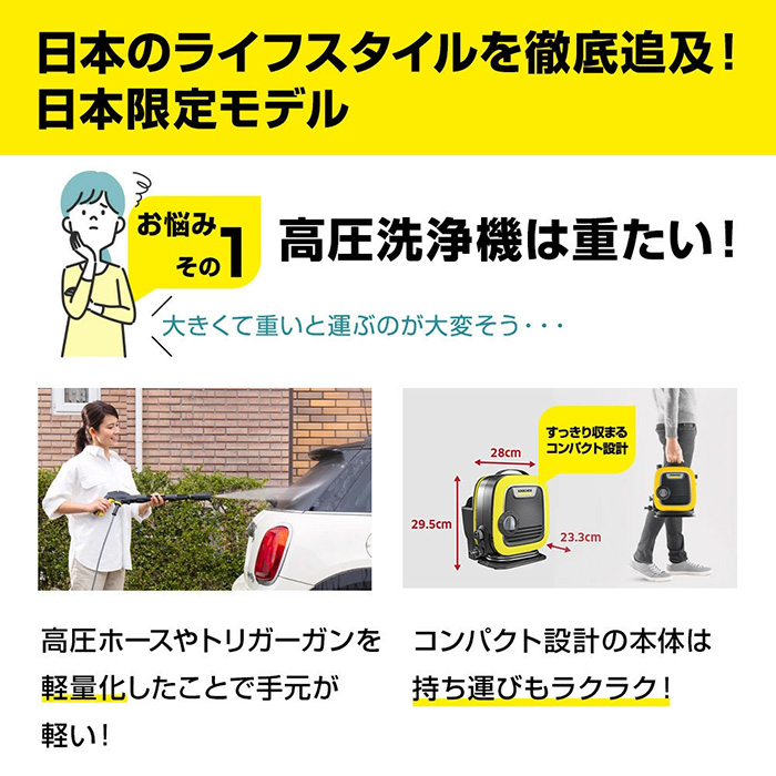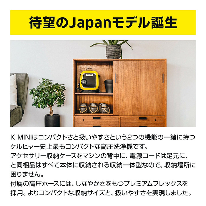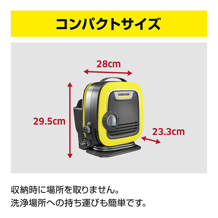 K MINIはコンパクトさと扱いやすさという2つの機能の一緒に持つケルヒャー史上最もコンパクトな高圧洗浄機です。