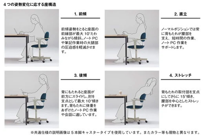 また、体重を前へ移動させると、座面が前方に傾斜。大腿部への圧迫を感じさせることなく、デスクワークを快適にサポートします。一見、そのリビングライクな姿からは、想像もつかない多彩な機能を搭載した“vertebra03”。ワークチェアの未来はこのイスから始まります。