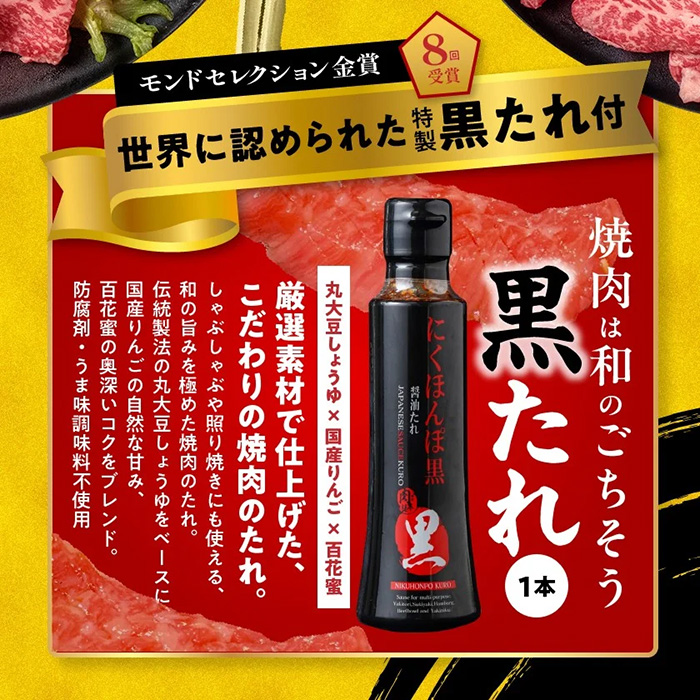 また、モンドセレクション7回金賞受賞のオリジナル焼肉のタレ「にくほんぽ黒」を1本お付けいたします。