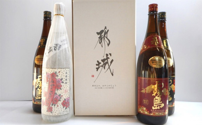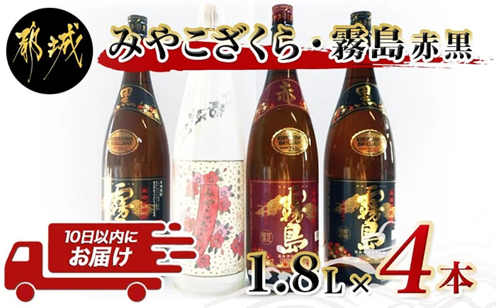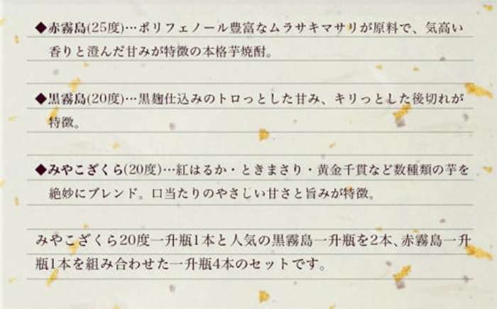 みやこざくら20度一升瓶1本(ふるさと納税オリジナルボトル)と人気の黒霧島一升瓶を2本、赤霧島一升瓶1本を組み合わせた一升瓶4本のセットです。
