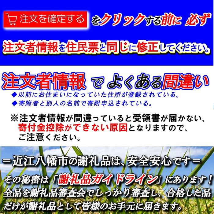 ※迅速・正確な発送のため早期発送準備に取り掛かっており、ご寄付に対する感謝特典でもあるため、入金後のキャンセル・変更はお受けできませんので、寄附金額、申込者名、謝礼品内容、お申込み内容等に誤りがないか、今一度、十分にご確認をお願いします。