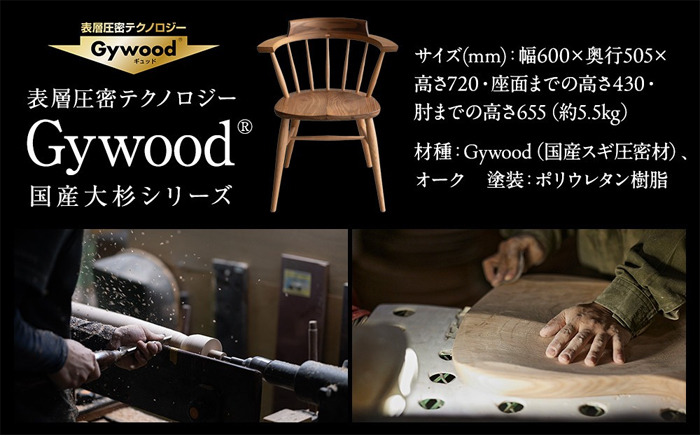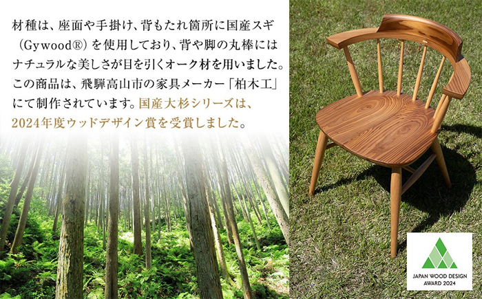 材種は、座面や手掛け、背もたれ箇所に国産スギ(Gywood®)を使用しており、背や脚の丸棒にはナチュラルな美しさが目を引くオーク材を用いました。