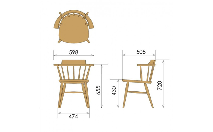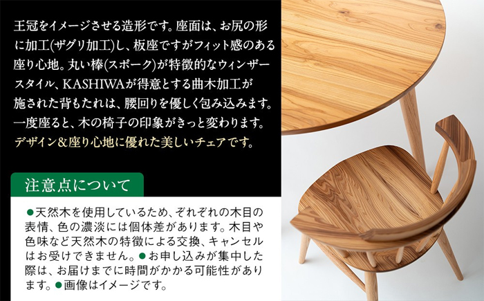 クラウン…王冠をイメージさせる造形です。座面は、お尻の形に加工(ザグリ加工)し、板座ですがフィット感のある座り心地。丸い棒(スポーク)が特徴的なウィンザースタイル、KASHIWAが得意とする曲木加工が施された背もたれは、腰回りを優しく包み込みます。一度座ると、木の椅子の印象がきっと変わります。デザイン&座り心地に優れた美しいチェアです。