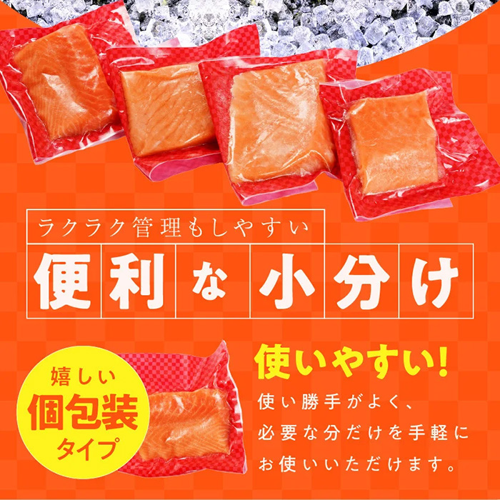 新鮮な状態のサーモンを、浸透圧脱水シートで一枚一枚丁寧に真空包装することで、余分な水分を吸収し旨味成分を閉じ込めて、高鮮度のまま急速冷凍しています。