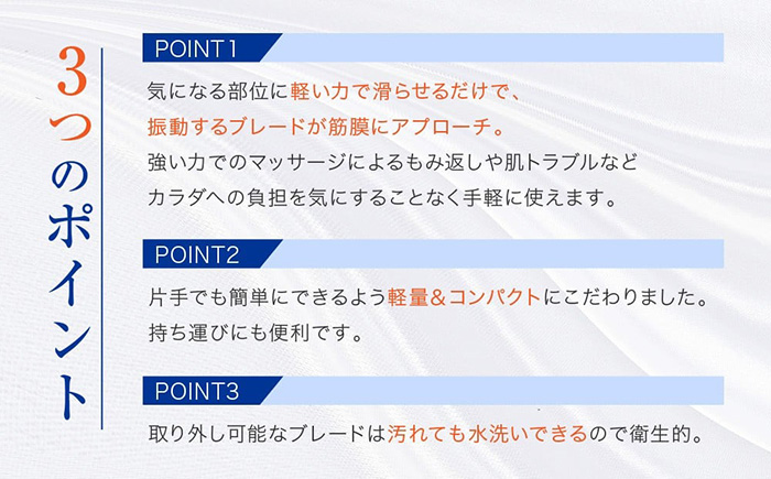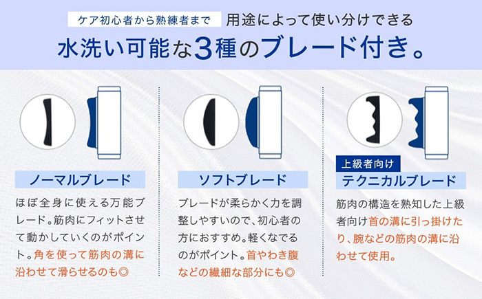 プロのアスリートをケアするトレーナーが監修した、自宅で出来る簡単セルフケアアイテム。用途によって使い分けできる水洗い可能な3種のブレード付き。