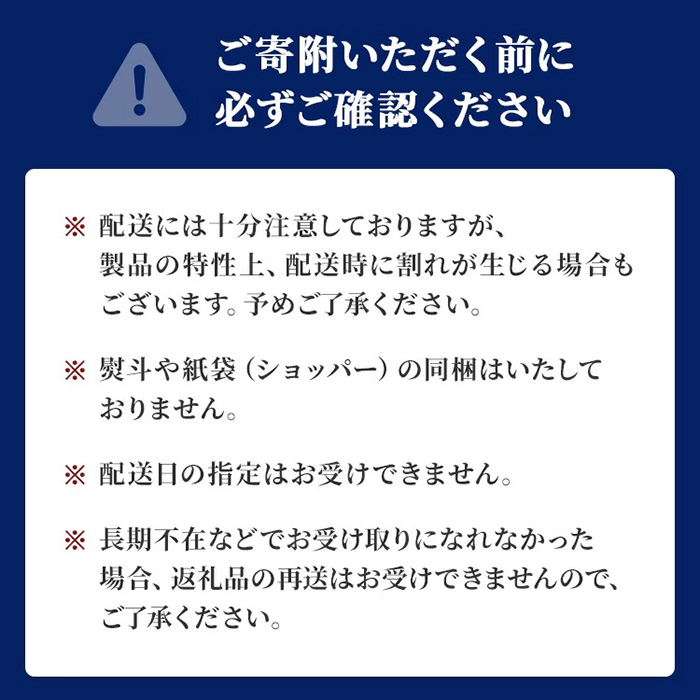 ※長期不在などでお受け取りになれなかった場合、返礼品の再送はお受けできませんので予めご了承ください。