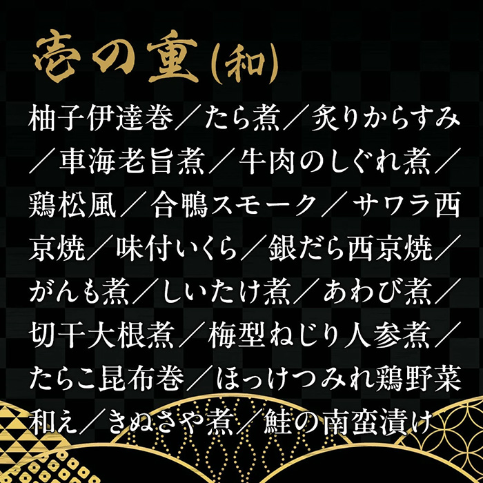 柚子伊達巻、たら煮、炙りからすみ、車海老旨煮、牛肉のしぐれ煮、鶏松風、合鴨スモーク、サワラ西京焼、味付いくら、銀だら西京焼、がんも煮、しいたけ煮、あわび煮、切干大根煮、梅型ねじり人参煮、たらこ昆布巻、ほっけつみれ鶏野菜和え、きぬさや煮、鮭の南蛮漬け