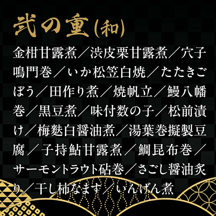 金柑甘露煮、渋皮栗甘露煮、穴子鳴門巻、いか松笠白焼、たたきごぼう、田作り煮、焼帆立、鰻八幡巻、黒豆煮、味付数の子、松前漬け、梅麩白醤油煮、湯葉巻擬製豆腐、子持鮎甘露煮、鯛昆布巻、サーモントラウト砧巻、さごし醤油炙り、干し柿なます、いんげん煮