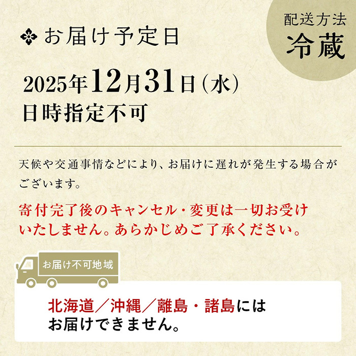 | 発送日 | 寄附金受領確認後、2025年12月31日(時間指定不可)のお届けとなります。