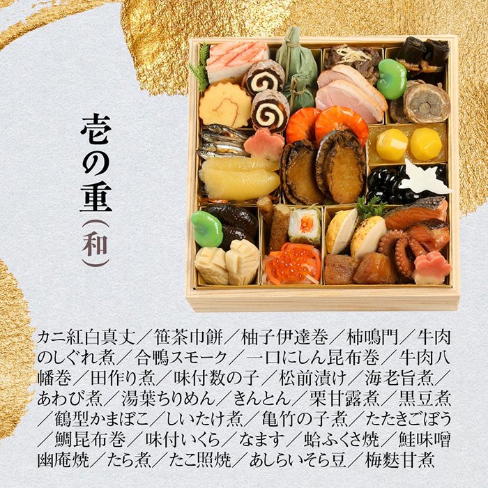 カニ紅白真丈、笹茶巾餅、柚子伊達巻、柿鳴門、牛肉のしぐれ煮、合鴨スモーク、一口にしん昆布巻、牛肉八幡巻、田作り煮、味付数の子、松前漬け、海老旨煮、あわび煮、湯葉ちりめん、きんとん、栗甘露煮、黒豆煮、鶴型かまぼこ、しいたけ煮、亀竹の子煮、たたきごぼう、鯛昆布巻、味付いくら、なます、蛤ふくさ焼、鮭味噌幽庵焼、たら煮、たこ照焼、あしらいそら豆、梅麩甘煮