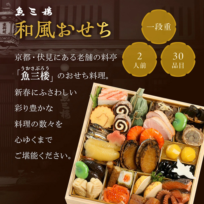 京 伏見の地で二百五十余年にわたる長い歴史を刻んできた「魚三楼」監修の和風おせちを御賞味ください。