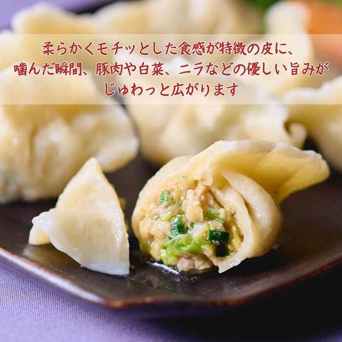 柔らかくモチッとした食感が特徴の皮に、噛んだ瞬間、豚肉や白菜、ニラなどの優しい旨みがじゅわっと広がります。餡にしっかりと味がついているのでそのままでも美味しく召し上がれます。素材の旨みを引き出すため、ニンニクは不使用!子供からお年寄りまで幅広く愛されている水餃子です。