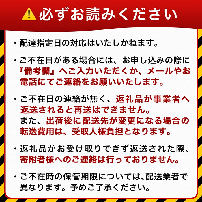 ※新規取扱い返礼品につき、通常よりもお届けまでにお時間をいただく場合がございます。 また、年末年始期間中は、お申込みが集中するため、通常よりもお届けまでにお時間を要する場合がございます。あらかじめご了承ください。 ※お届け時期のご指定はお受けできません。 ※ご不在日や住所変更の連絡がなく、返礼品が事業者へ返送されると再送はできません。 ※出荷後に配送先が変更になる場合の転送費用は、受取人様負担となります。 |
