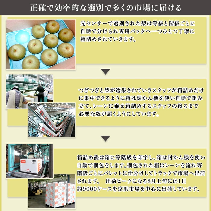 7月上旬からのハウス梨(幸水)を皮切りに、豊水、あきづき、県オリジナル品種の恵水、新高、にっこりなど、品種を変えながら